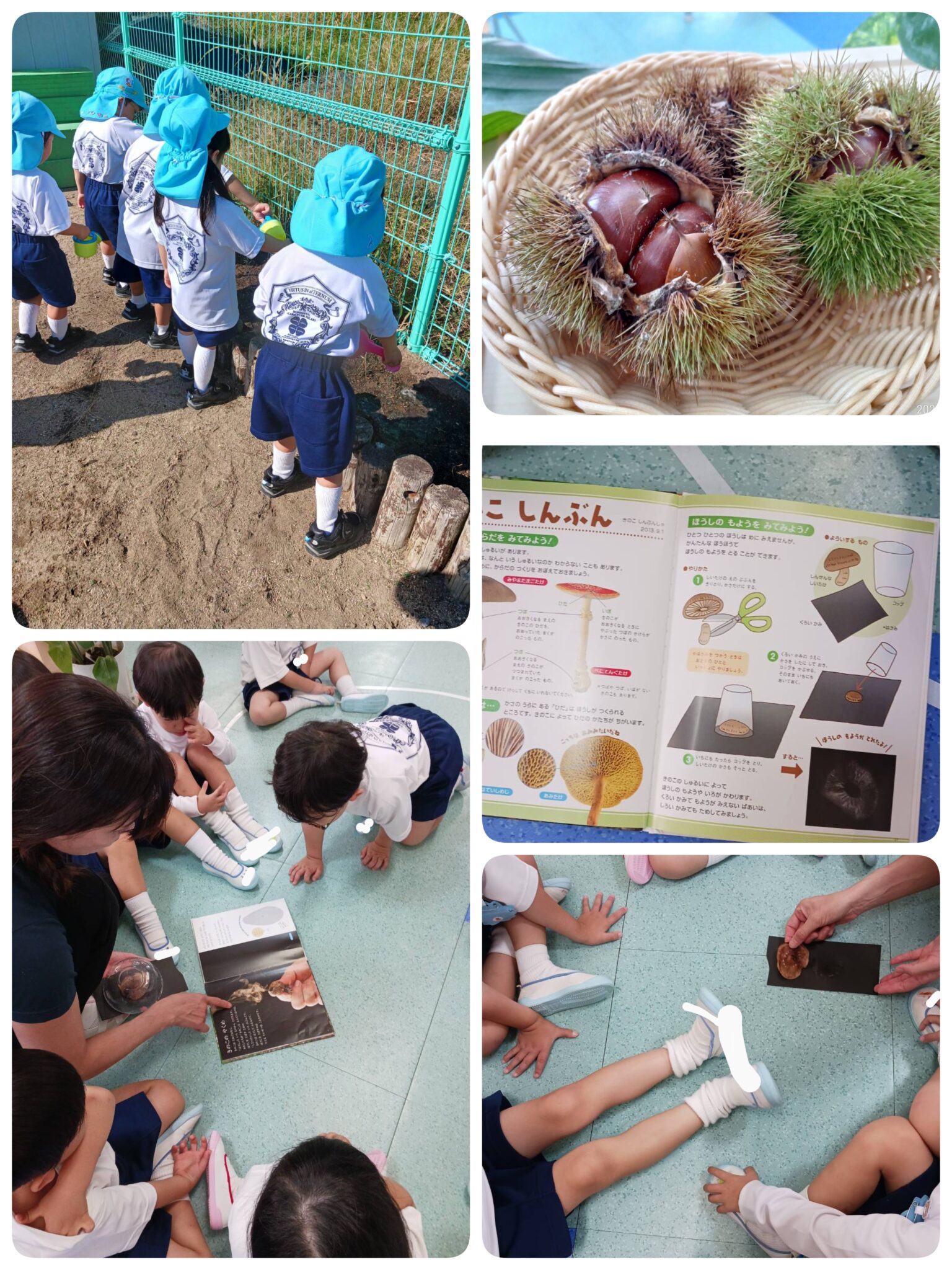 今日の空組はおしごと、お遊戯の練習、先日蒔いた大根の種に水やり、栗の絵を描く、しいたけの胞子の観察をしました。