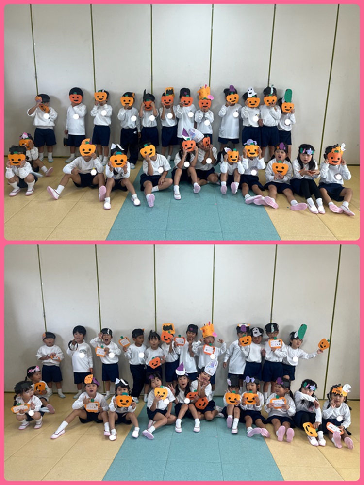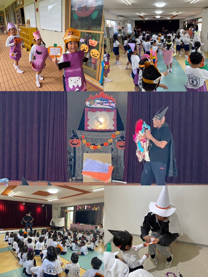 今日は、全学年でハロウィンパーティをしました。事前に各学年で作ったコスチュームを身に付けて、