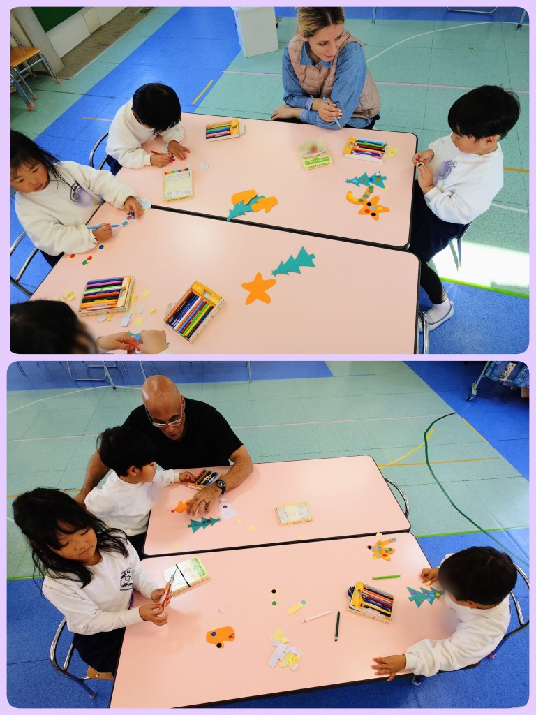 Christmas tree や Snowman、Mittens、Candy、Star などにシールを貼り、クーピーで楽しく描き込みもしました。
