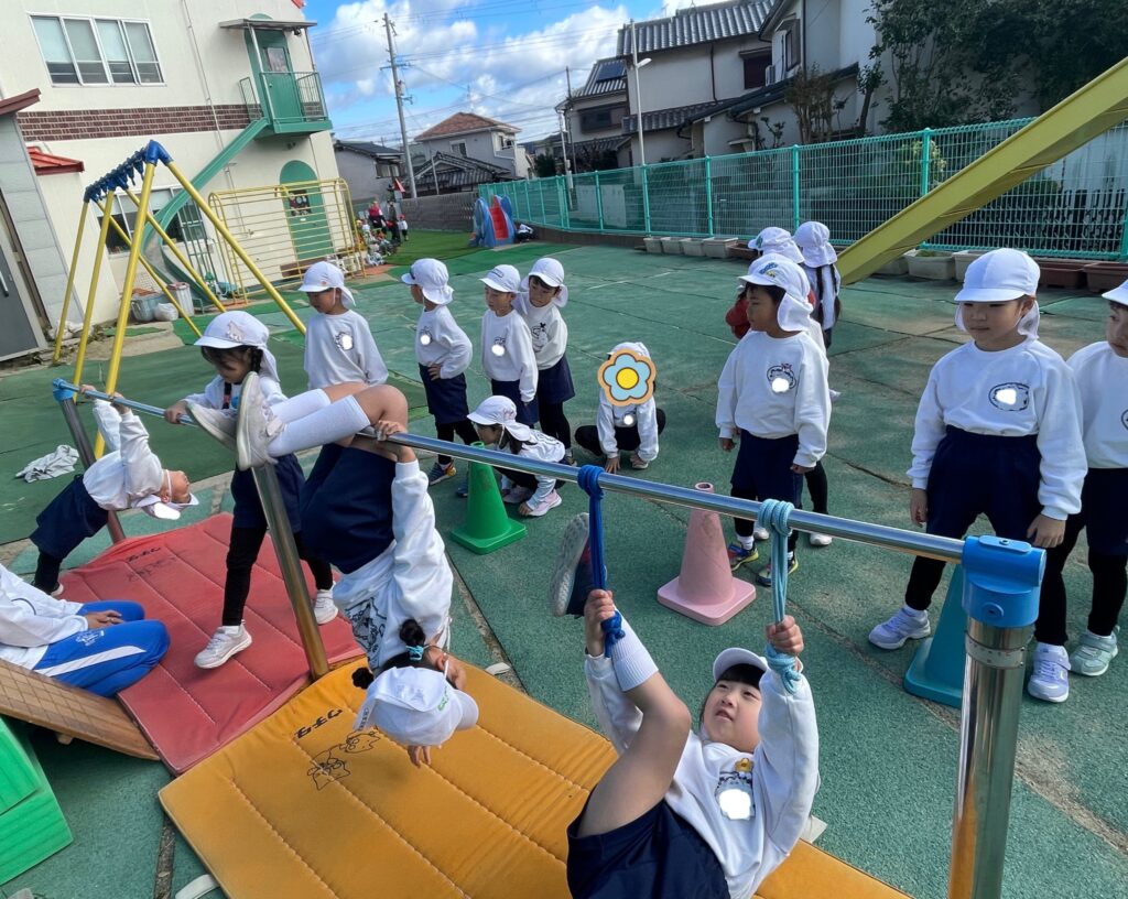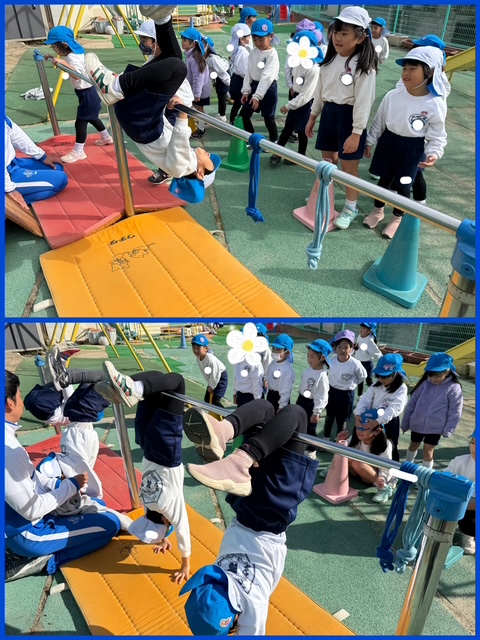 午前中は運動あそびで鉄棒を頑張りました。