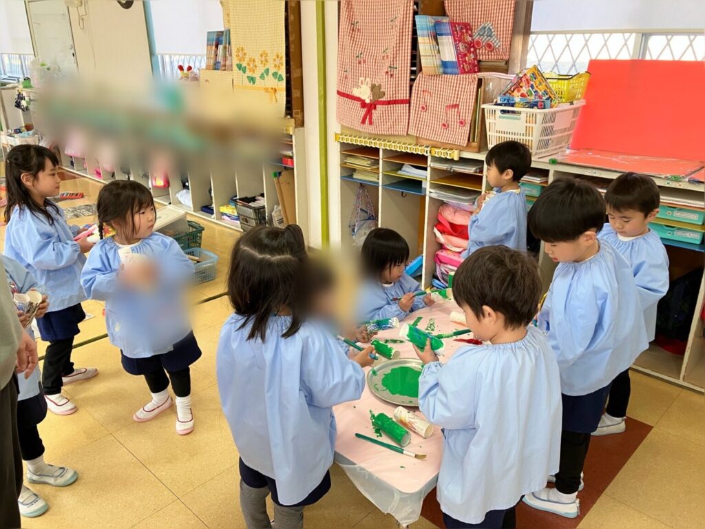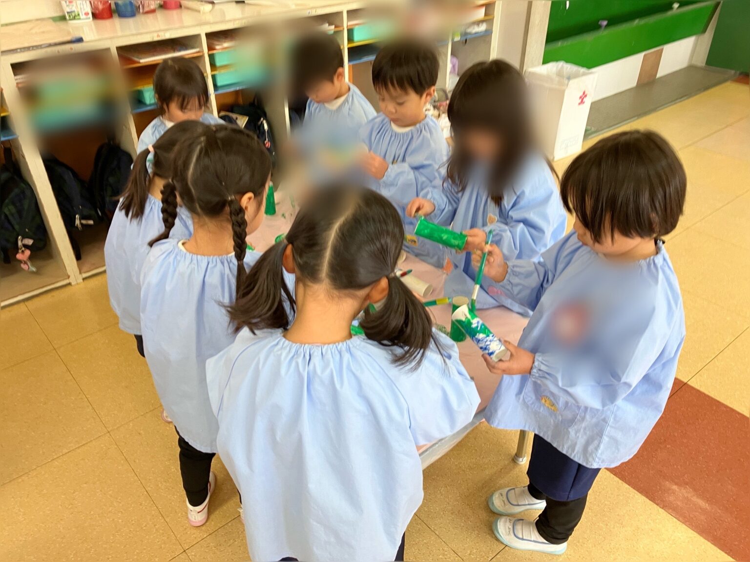 その後は、共同画の大きな画用紙に「おにゃけ」を貼って完成させたり、