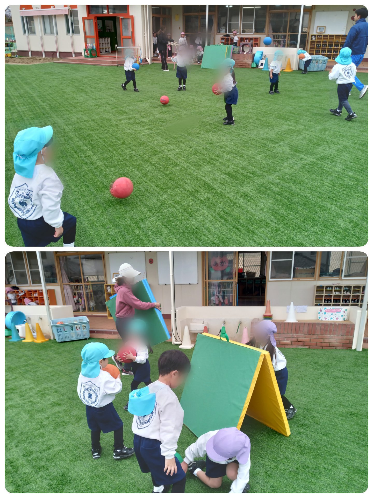 転がしたり、マットに投げて当てたりと楽しそうに取り組んでいましたよ。