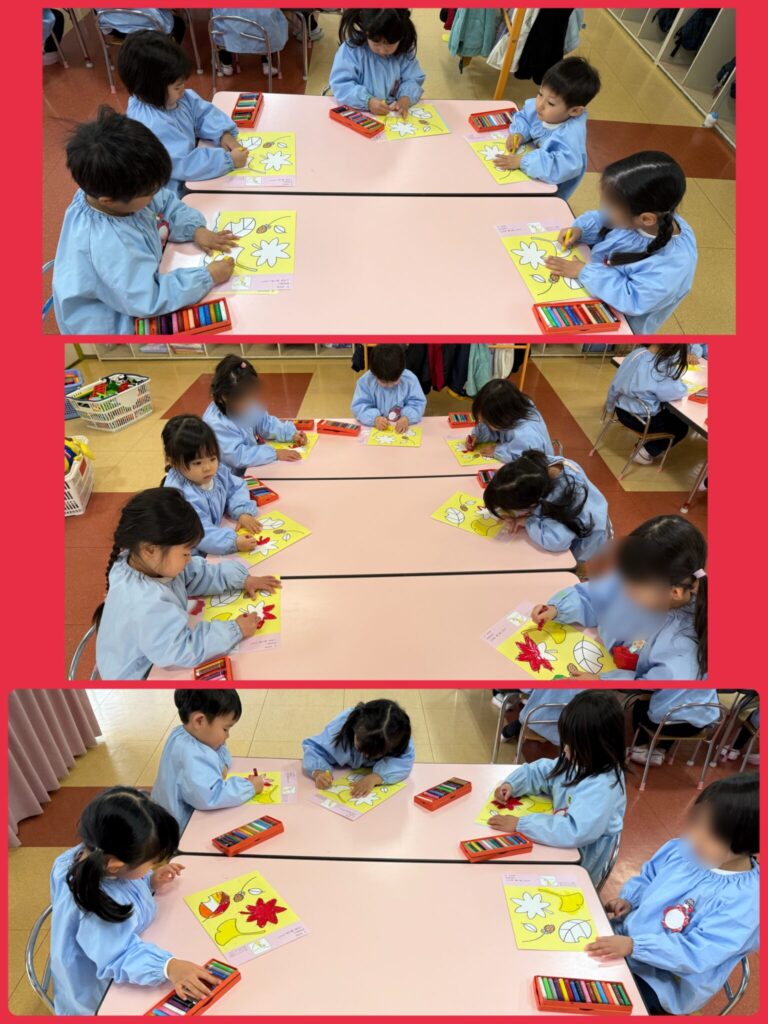 落ち葉の色塗りをはみ出さないように、しっかりとクレパスで塗りこんだり、