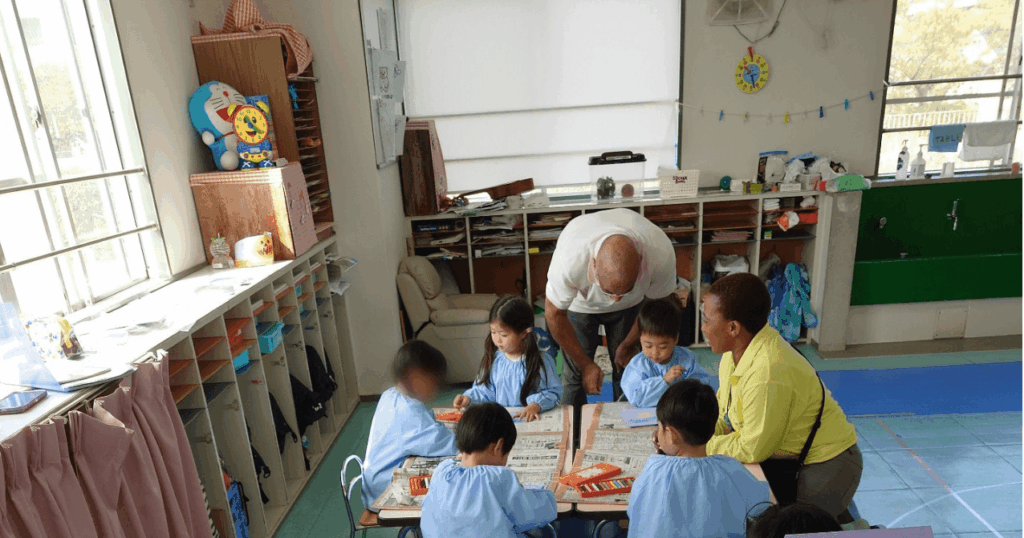 大変お待たせいたしました。本日から教育日記再開です!できる限り、日々の保育の様子をお届けしたいと思います♪よろしくお願いします。今日の年中組は、折り紙で切り絵製作と、園庭で玉入れ・お遊戯の練習をしました。折り紙で三角や四角を2回折り、まわ...