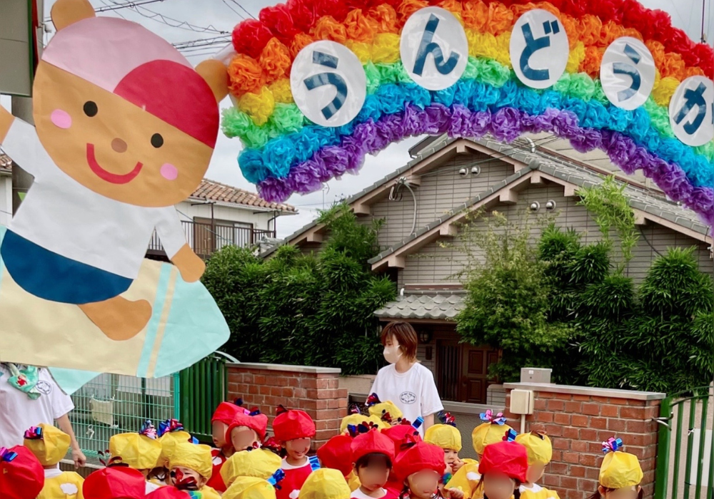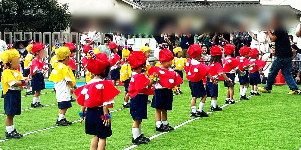 運動会では、子どもの成長に合わせて玉入れや鼓隊・組立体操など、楽しい時間を過ごします。達成感や悔しさを覚え、成長する過程を応援してあげてください。